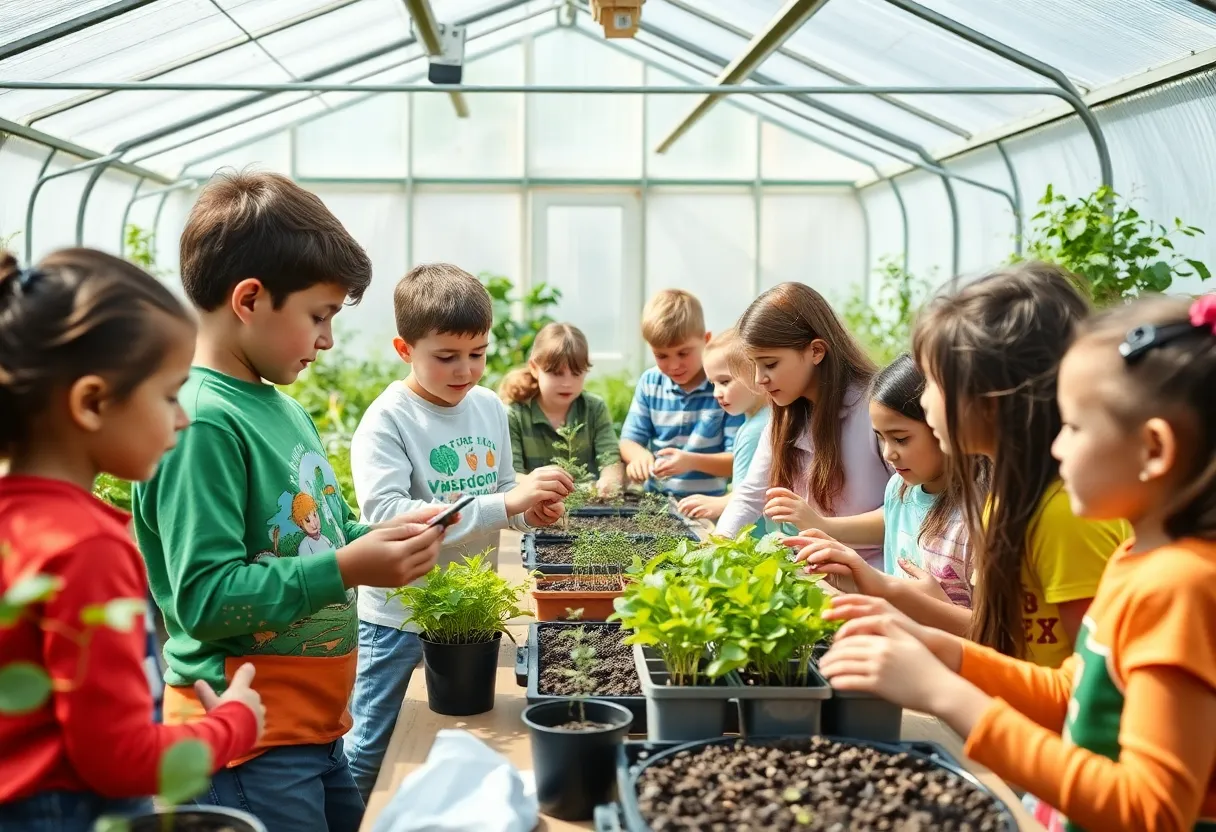 Students participating in the Environmental Science Program at their school, working in a greenhouse.